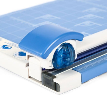 Permite hacer cortes desde A7 hasta A4 y la tabla tiene 12 pulgadas (30.48 cm) en espacio de trabajo con guías de corte en centímetros y pulgadas.