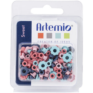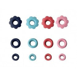 Paquete con 120 Eyelets de flores y cículos de tres tamaños de colores azul oscuro, azul claro, rosado oscuro y rosado claro. de 0.9m mm de diámetro (0.32")
