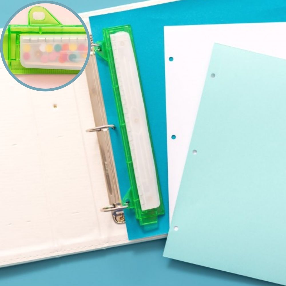 Por su diseño compacto, puedes agregar fácilmente hojas a tus carpetas y journals. Además, cuenta con un espacio para guardar el confetti, evitando desorden.