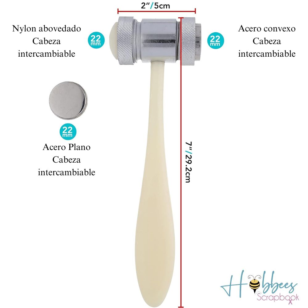 - 3 Cabezas intercambiables ( acero convexo, nylon abovedado y acero plano).