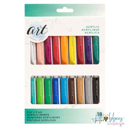 - 18 tubos de pintura acrílica en 18 colores diferentes, cada una de 8 ml.