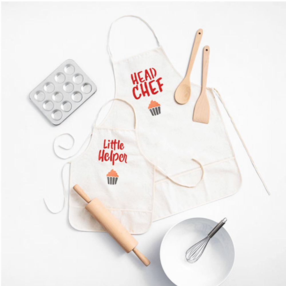 Todo lo que necesitas para personalizar dos delantales de lona: uno para niños y otro para adultos.