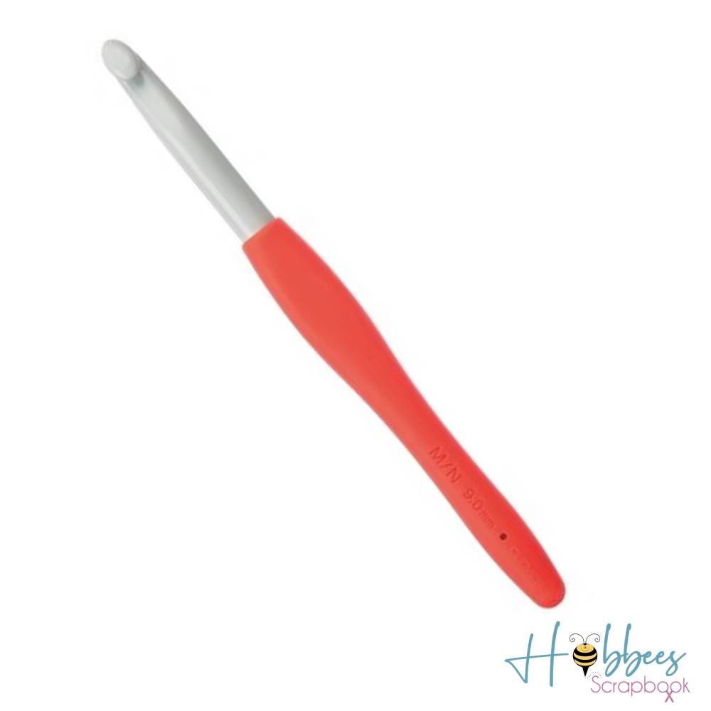 Los mangos de los ganchos vienen en colores vibrantes para fácilmente identificar los tamaños. Están hechos de hule elastómero, haciendo crochet confortable y libre de estrés.