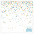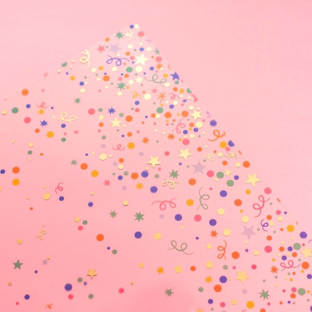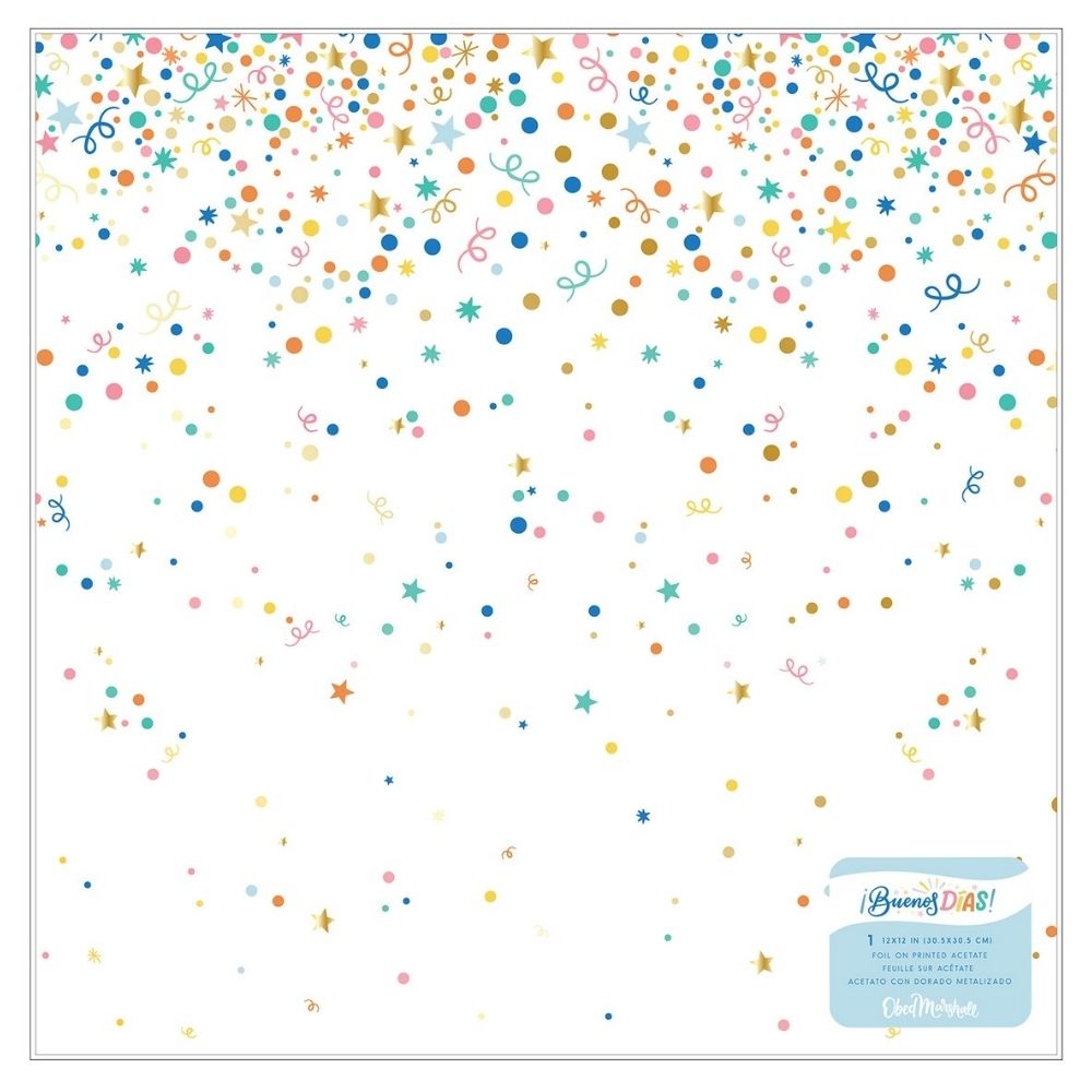 Estampado: Patrón con estrellas, puntos y serpentinas en diferentes colores sobre una hoja de acetato transparente con aplicaciones en foil dorado.