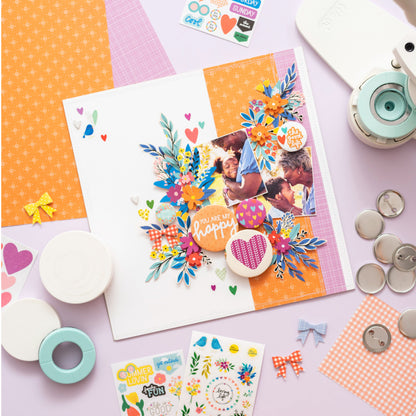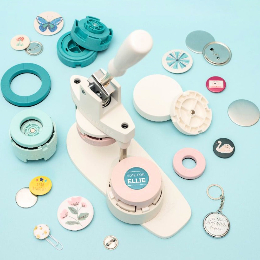Máquina Button Press, nos permite crear botones, imanes, pinzas, clips, estampas de foam o llaveros y es compatible con diferentes materiales como papel, cartón o tela.
