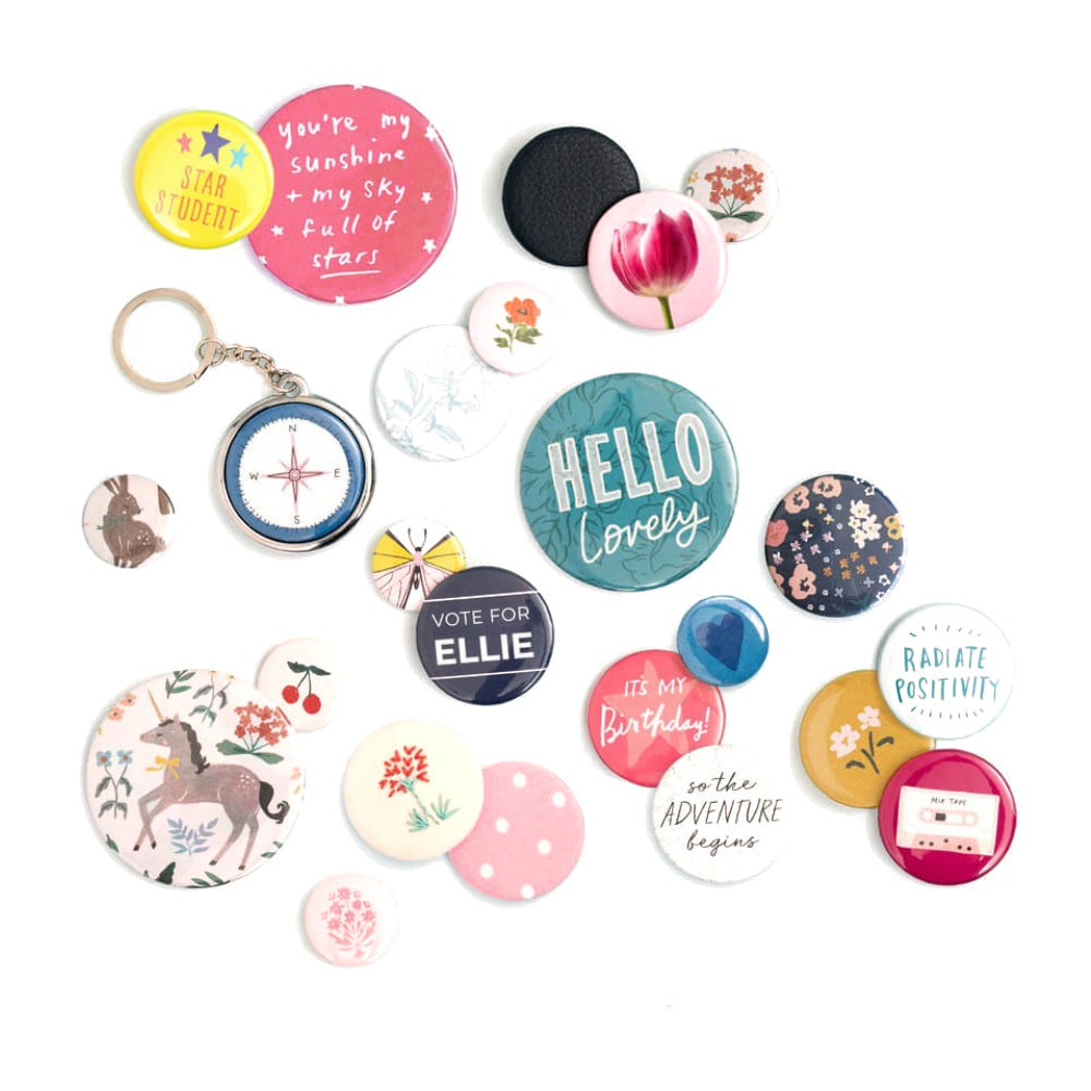 La Button Press puede crear botones de tres medidas diferentes: pequeña (25mm), mediana (37mm incluida con la máquina) y grande (58mm) *se venden por separado