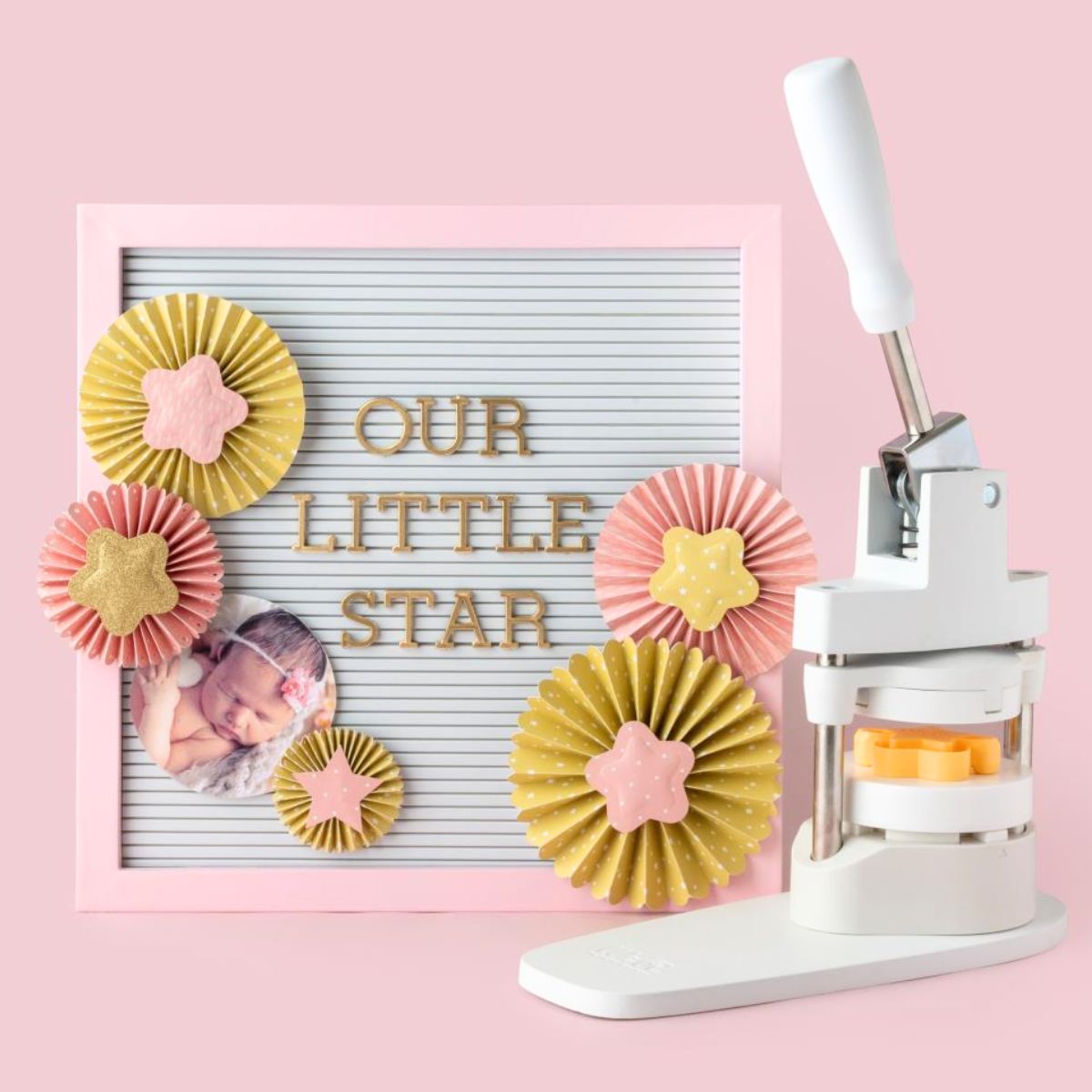 Adiciona a tu Button Press Machine (se vende por separado) este inserto para crear pegatinas esponjosas y formas de estrellas agitadoras. Incluye herramientas para presionar botones, piezas de pegatinas esponjosas (5) y piezas con forma de agitador (5)