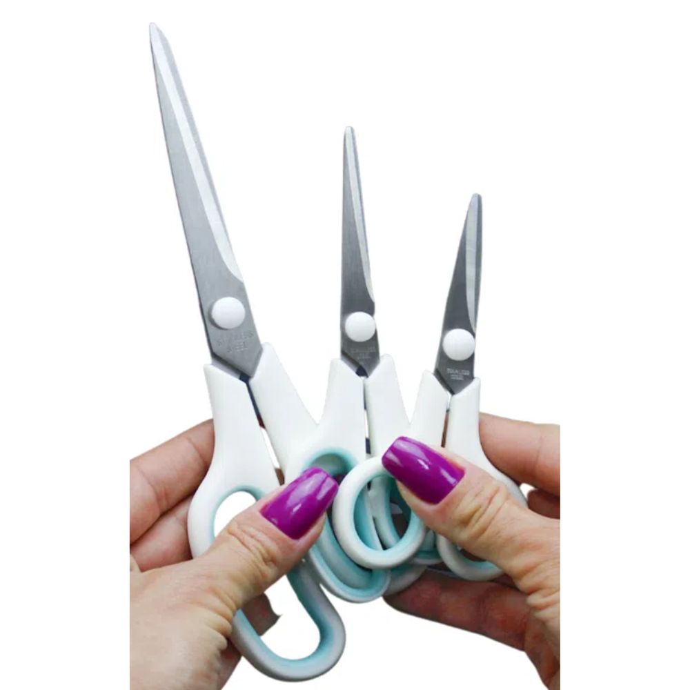 Las tijeras son herramientas imprescindibles para tú oficina, sala de manualidades y el aula. Son tan versátiles que no querrás usar nada más. Este set de tijeras viene con tres tamaños (pequeña 10.5 cm, mediana 17.8 cm y grande 21.5 cm), perfectas para cortar en tus proyectos como álbumes de recortes, tarjetas y más.
