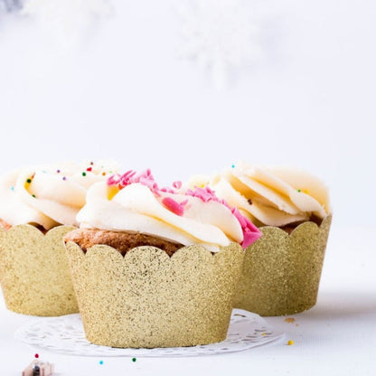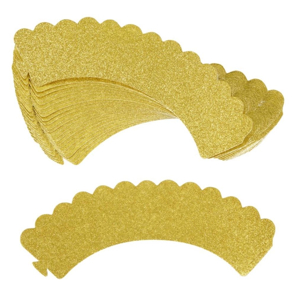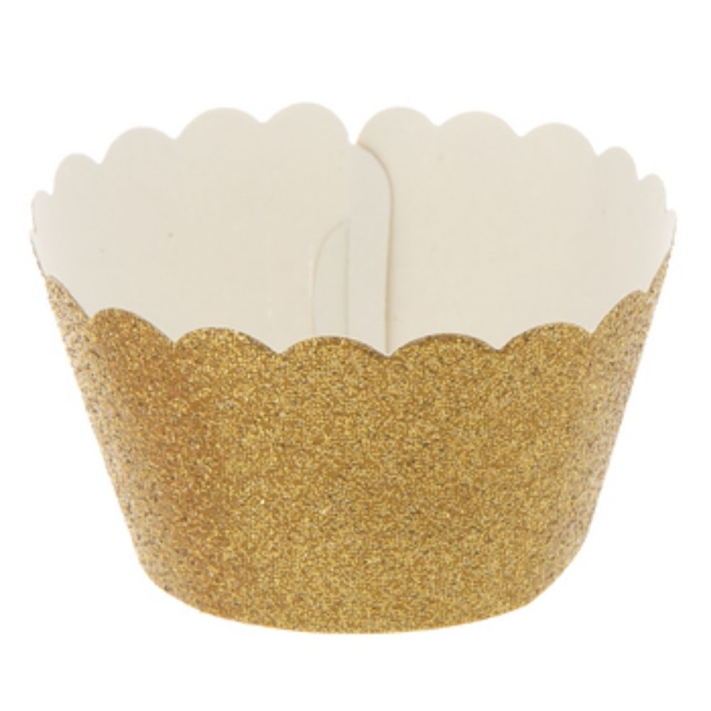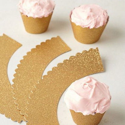 ¡El complemento perfecto para resaltar tus cupcakes! Este diseño en color oro con aplicaciones brillantes agrega un toque sofisticado a las mesas de dulces de tus eventos. No horneables (No son capacillos).