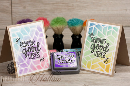 Las Distress Oxide tienen una base compuesta de pigmentos y tinte, y, además reaccionan al agua. Que tengan una parte a base de pigmentos significa que vamos a poder trabajar con ellas sobre superficies oscuras como el kraft o el negro. El color de la tinta se seguirá viendo porque los pigmentos son opacos. Además, gracias a esta propiedad podemos construir múltiples capas una encima de otra sin que los colores se mezclen (si la capa anterior está seca, si está mojada se mezclarán). El acabado es chalky (tiza).