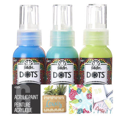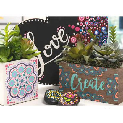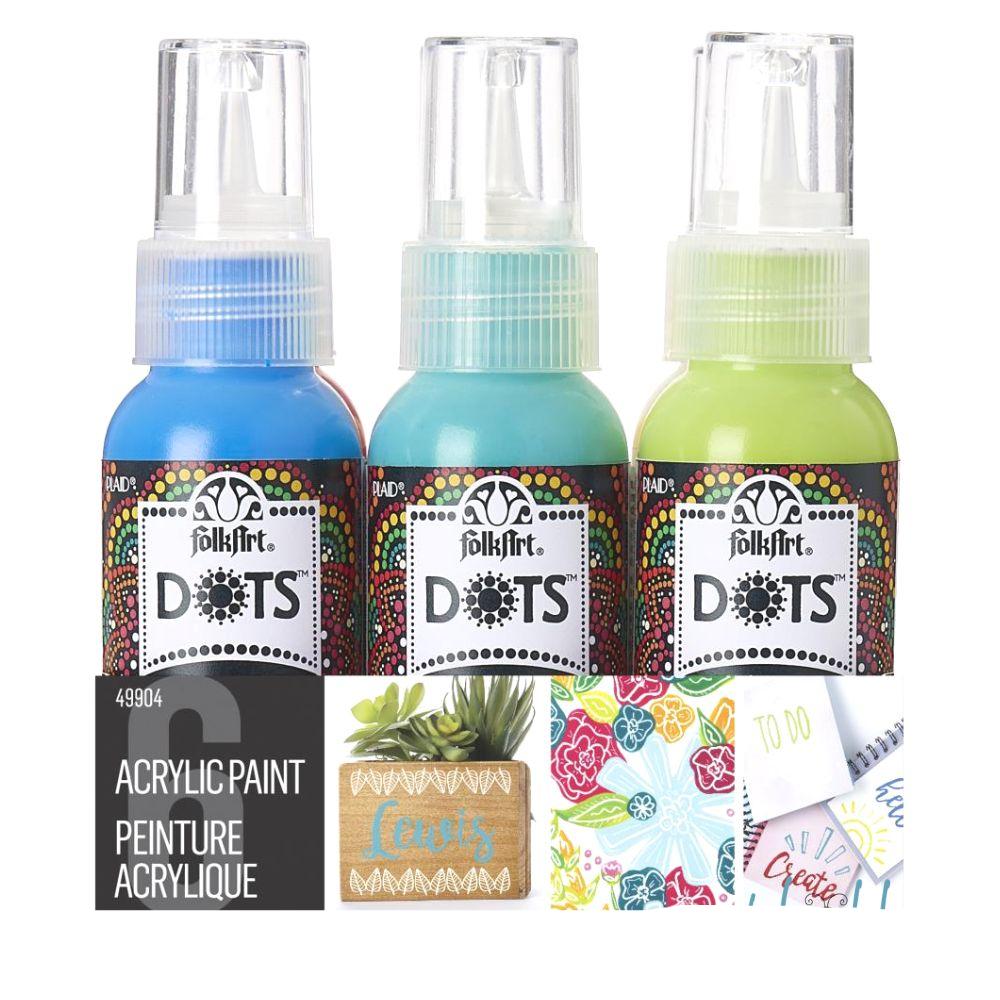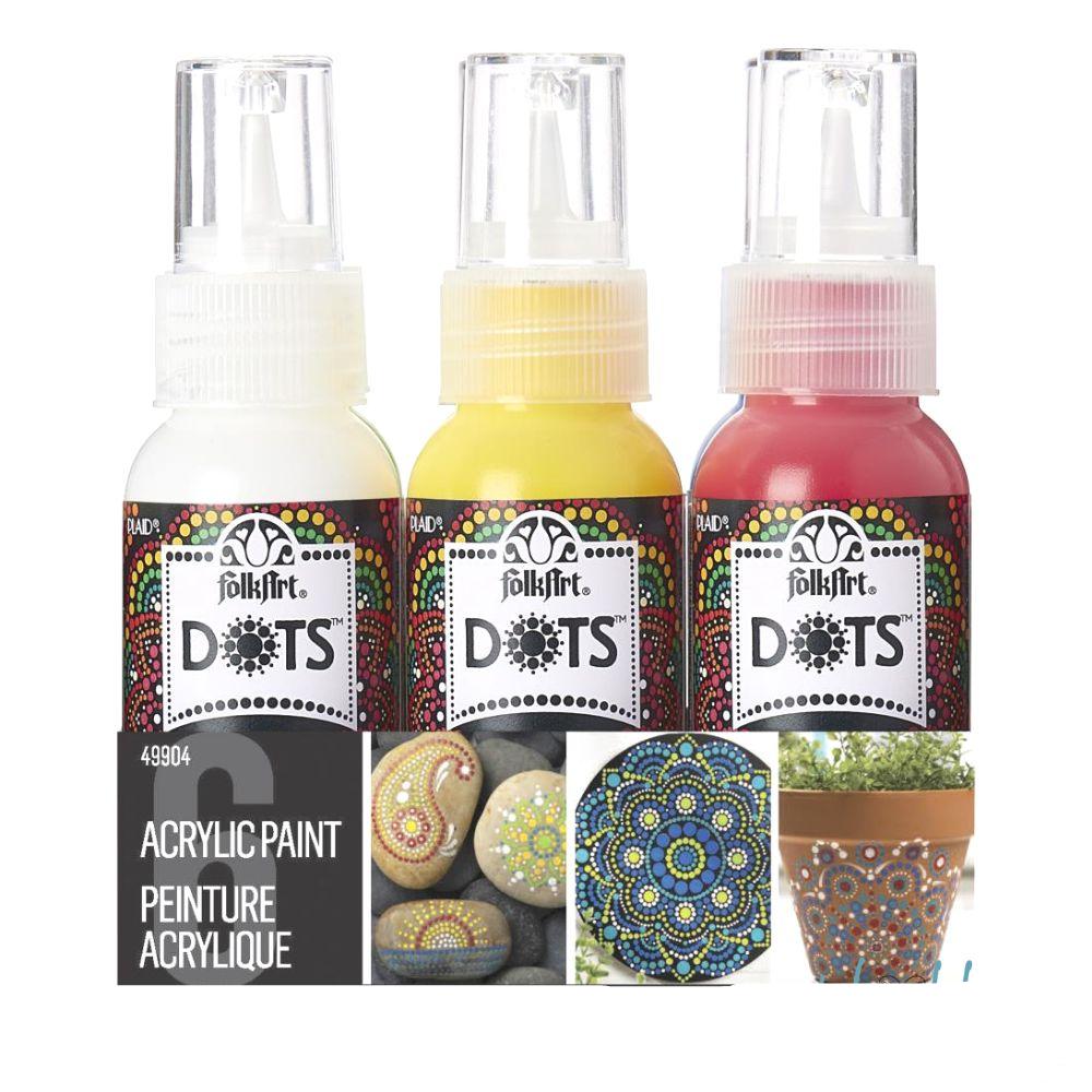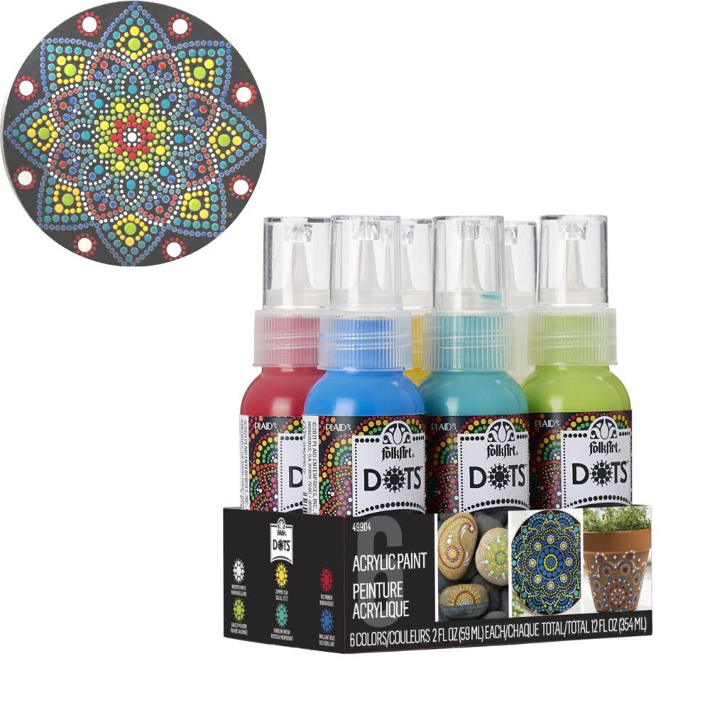 El juego de pintura acrílica de puntos FolkArt de 6 piezas es la pintura perfecta para todo tu arte en mandalas y mucho más. Decora fácilmente vidrio, cerámica, madera, metal, terracota y más con esta colección de colores.