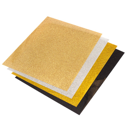 - 4 hojas de transferencia para tela de glitter colores: plata, oro brillante, negro y dorado. cada una mide 21.6 x 27.94 cm (8.5x11 pulgadas.)