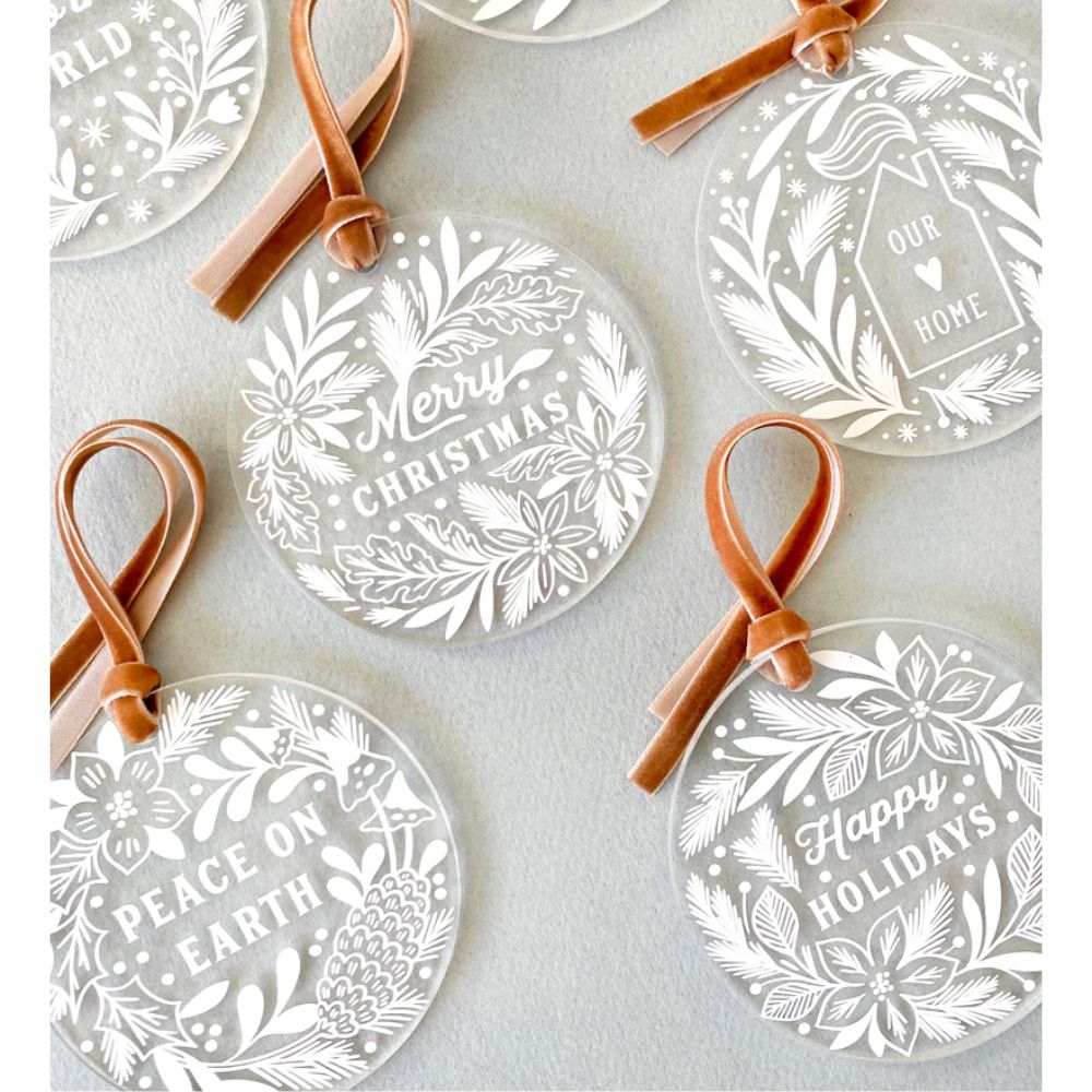 Son fabricadas en acrílico transparente, se decoran con un texto de tu elección, se les agrega listón para colgar. Para personalizarlas puedes utilizar tintas al alcohol, pinturas acrílicas, vinil, y otros materiales.