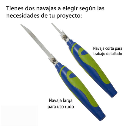 El mango hergonómico está elaborado un plástico resistente y con base de acero inoxidable. Al mismo tiempo, sirve como espacio de almacenado para guardar las navajas.