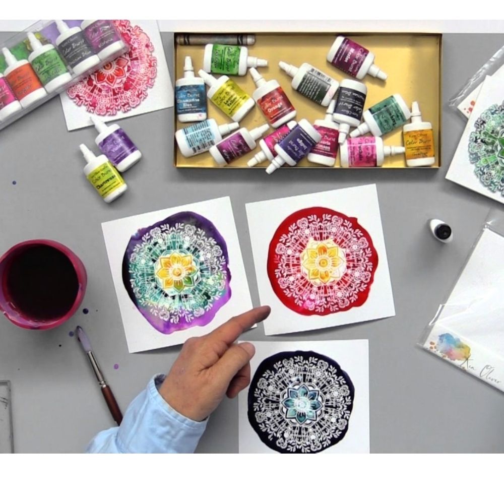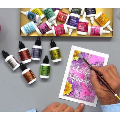 Puedes aplicar directamente de la botella, mezclarla con un medio o combinarla con tintas, acrílicos y acuarelas. Son traslúcidas, a base de agua, no tóxicos y pueden limpiarse con agua y jabón.
