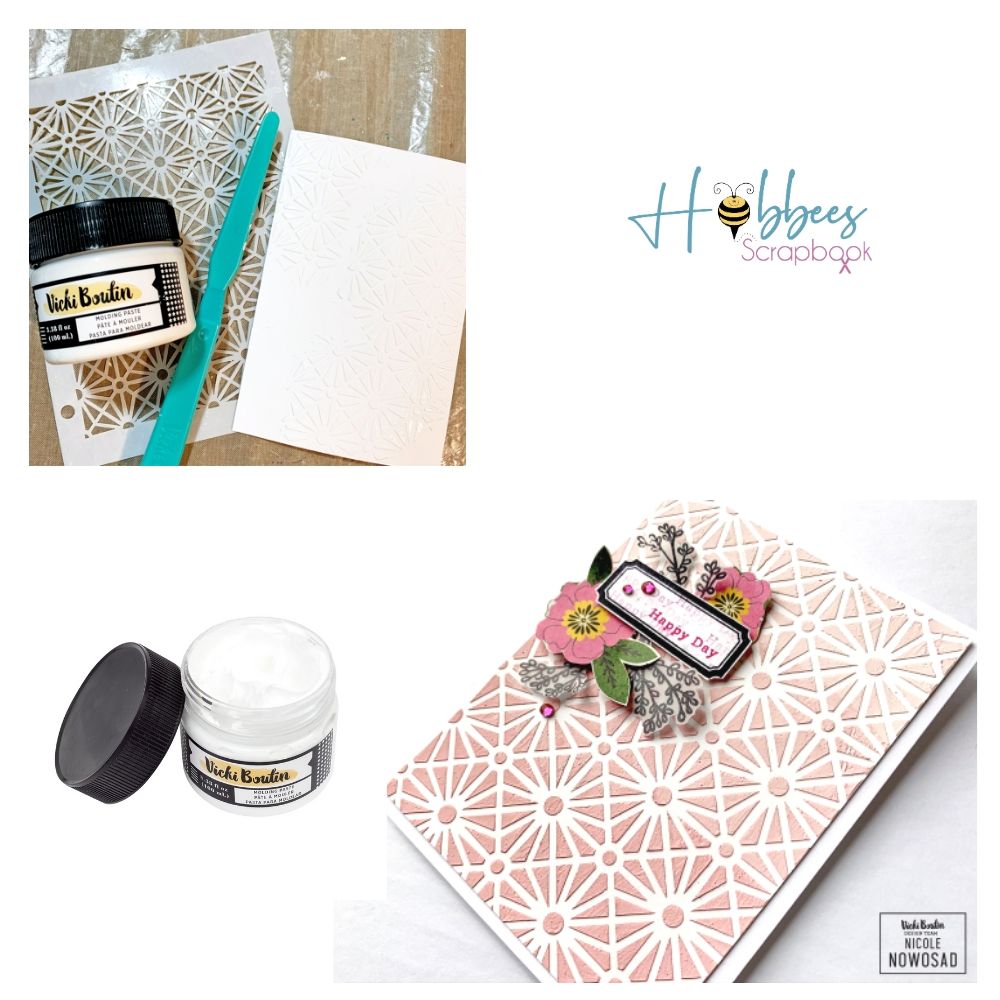 ¡Crea texturas y dimensiones únicas aplicando esta pasta de Vicki Boutin! Utilizala con plantillas y otras herramientas para crear efectos divertidos en proyectos de medios mixtos. Construye texturas 3D con stencils y más.