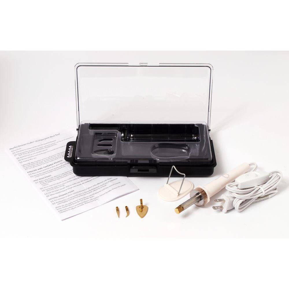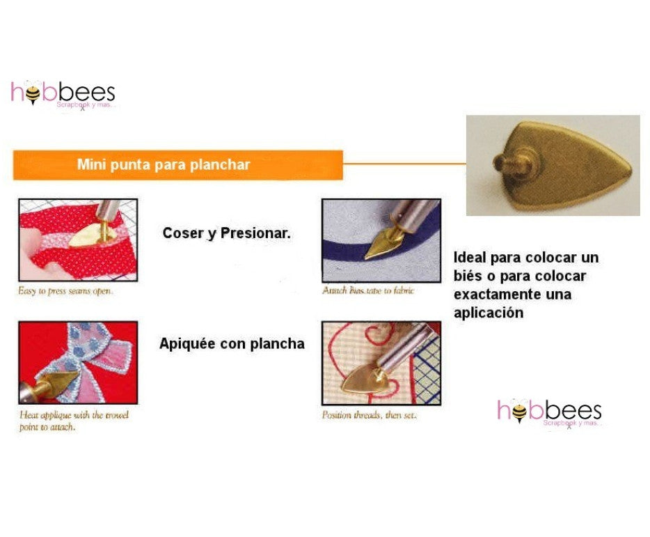 Herramienta con diferentes puntas que se calientan para realizar diferentes funciones. Ideal para transferir diseños, cortar película de plantillas (stenciles) y adherir adornos, marcar madera, cortar listones sintéticos, etc.