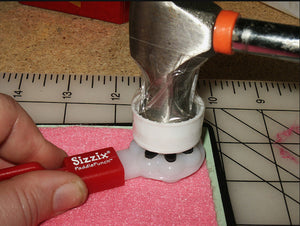 No requieren máquina, solo tienes que usar un mazo de goma (en cualquier ferretería) o un martillo normal cubierto con una tapa rosca como se muestra en la imagen. Lo colocas sobre un papel o cartulina o foamy, lo sujetas del mango rojo y pegas en la figura, ¡listo!