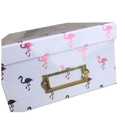 Caja de cartón decorada con flamingos metalizados foil rosa, ideal para almacenar fotos, sellos, embellishments, etc.