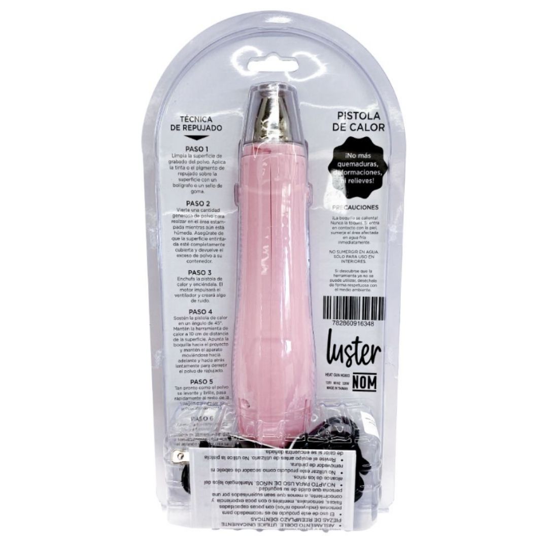 Esencial para poder realizar la técnica de embossing en caliente con polvos de realce o relieve, emite una moderada cantidad de aire, pero muy caliente, derritiendo sin problema y muy rápidamente los polvos de embossing.