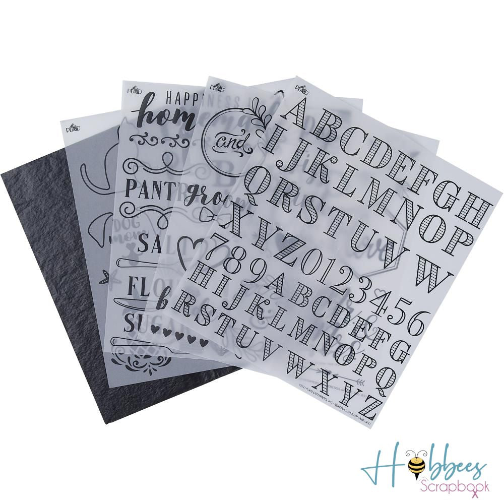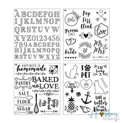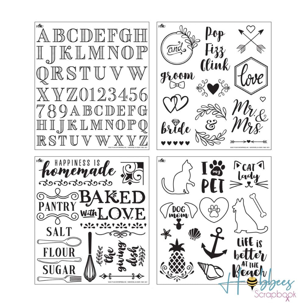Estas hojas de patrones de grabado incluyen una variedad de íconos que son geniales para personalizar tu decoración. Los temas de las hojas incluyen bodas, cocina, mascotas, playa y diseños de fuentes serif. Estas hojas son duraderas y reutilizables para su uso en múltiples proyectos.