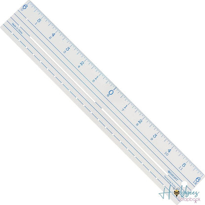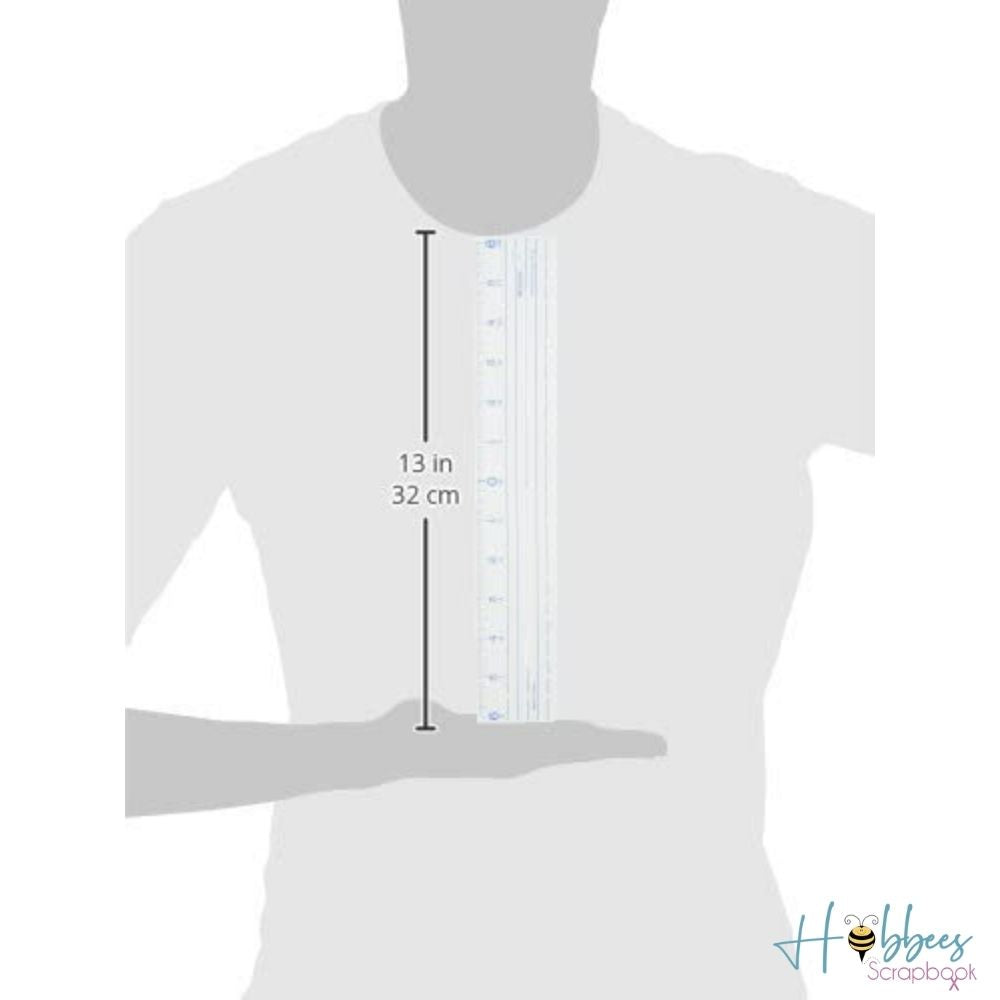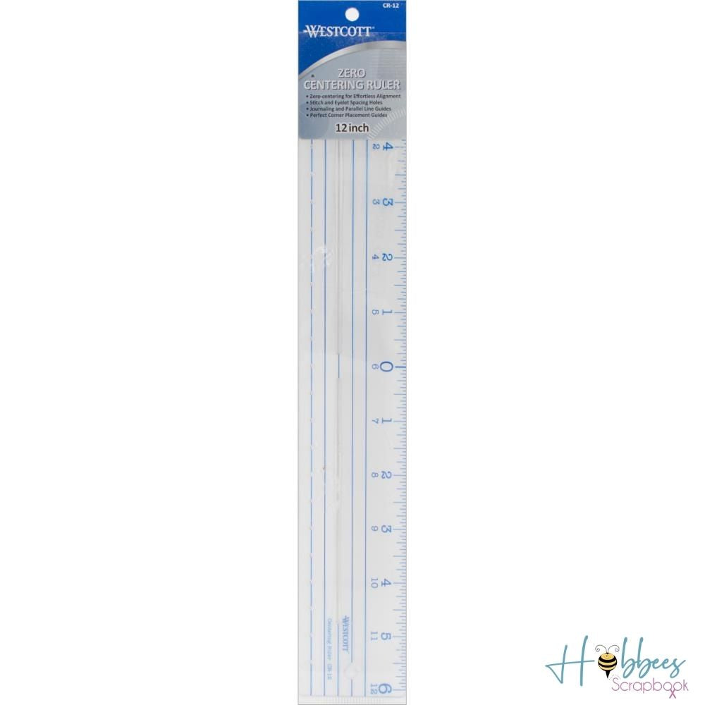 El centrado cero permite la alineación sin esfuerzo de fotos troqueladas y más. Los agujeros en la regla de plástico transparente se pueden usar para hacer puntadas uniformes y para alinear ojales o botones. El área de hendidura en la regla es ideal para guías de líneas paralelas para bordes o diarios.