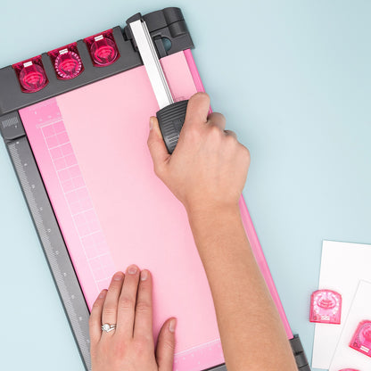 La cortadora de cartuchos intercambiables, te permite cortar papel y cartulina dándoles diferentes formas de manera fácil y rápida. Cada cuchilla tiene un orificio donde se ajusta a la perfección para evitar que se pierdan y a diferencia de las cuchillas de las cortadoras tradicionales, éstas son circulares por lo que te durarán más. Tiene una guía para insertar y retirar fácilmente el papel por debajo, después puedes ajustarla presionando hacia abajo para mayor estabilidad y asegurar el papel mientras cortas. Viene con diferentes marcas que te ayudaran a realizar el corte a la distancia exacta!