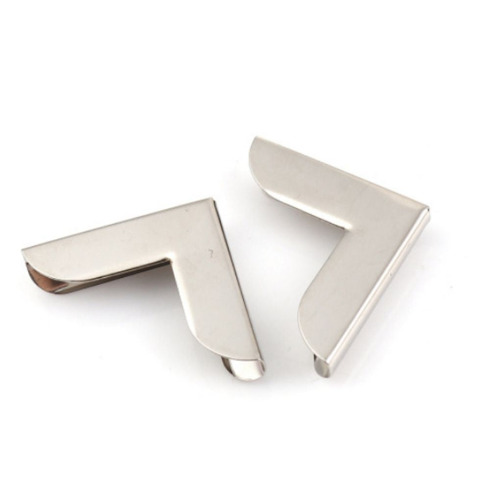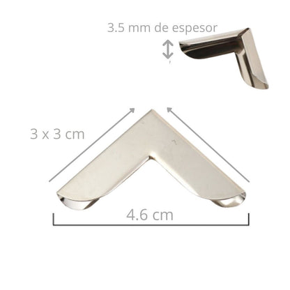 - 8 Esquineros de Hierro Plateado que miden 2cm x 2cm con capacidad para 2.5 mm de espesor (la abertura de la parte más ancha mide 4mm)