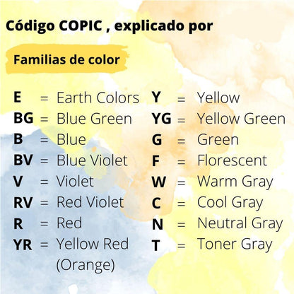 El Código Copic es una numenclatura que te ayuda a identificar los colores de forma fácil y sencilla: Las letras corresponden a la familia de color y los números corresponde al tono del color.