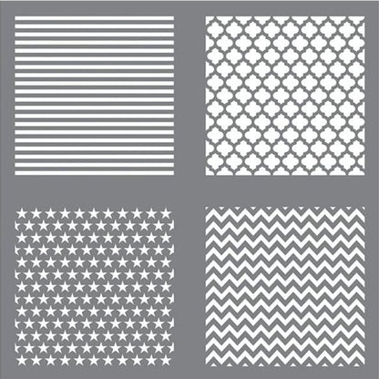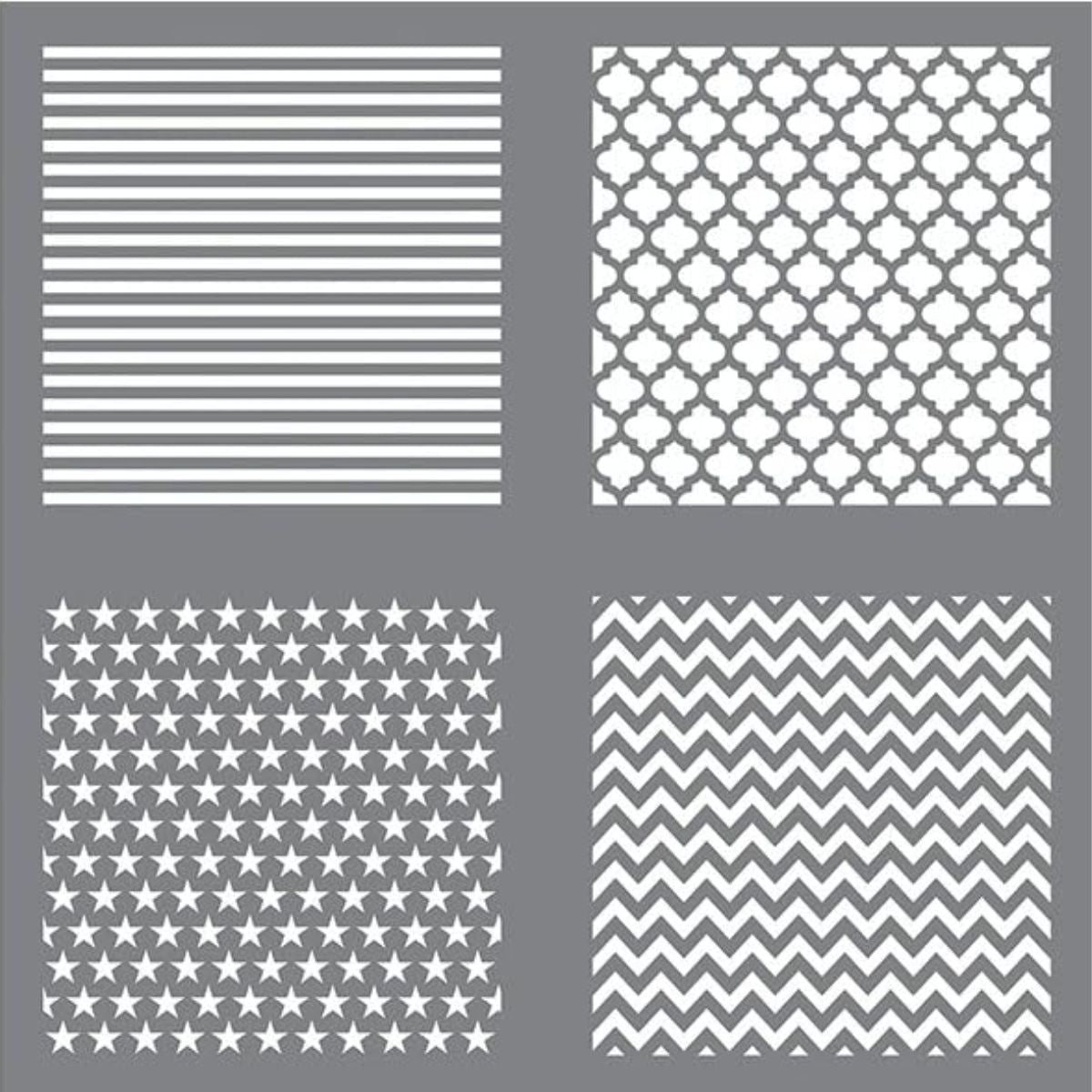- 1 Esténcil con patrones (rayas, zig zag, estrellas y reja) que mide 30.5 x 30.5 cm