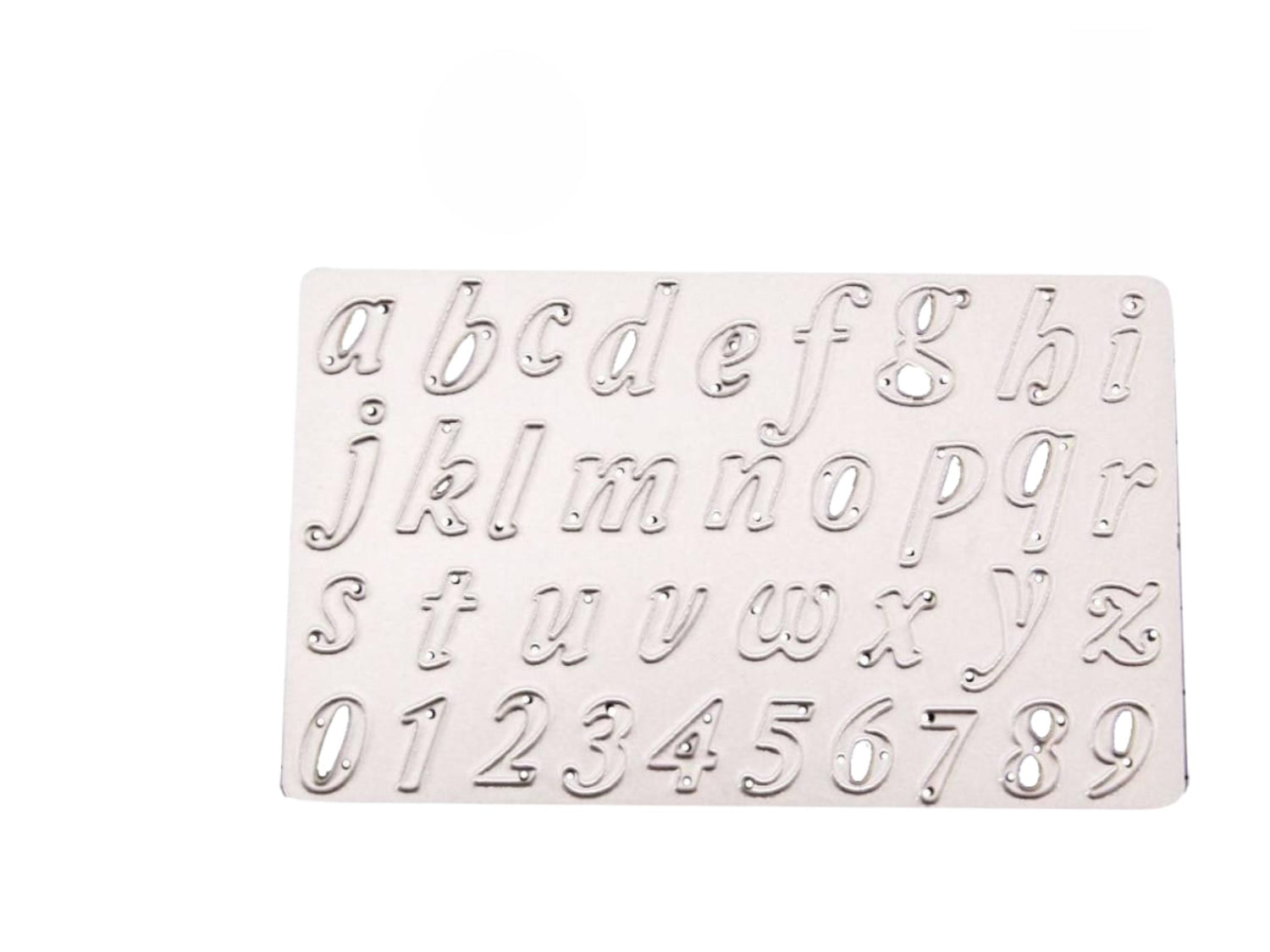 - 1 Suaje de letras minúsculas que miden cada letra aprox. 1 x 1.5cm (varia un poco ancho y alto depende de la letra). El suaje viene en una placa completa con el alfabeto que mide 6.6 x 10.8 cm aproximadamente.