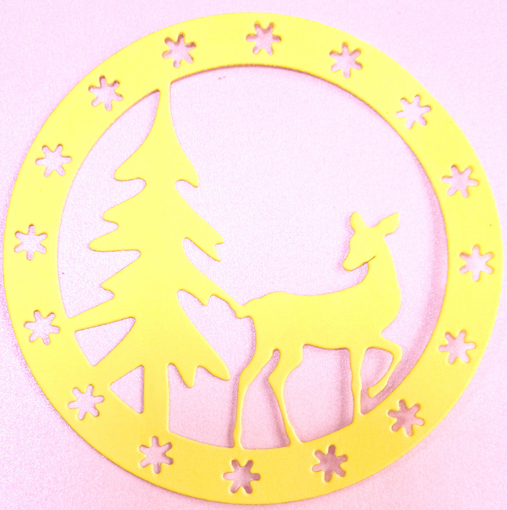 - 1 Suaje de círculo con reno y pino que miden 9.3 cm.