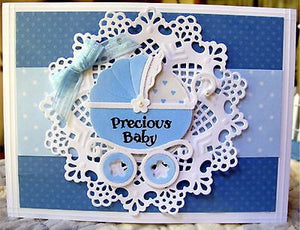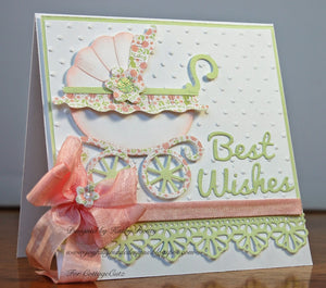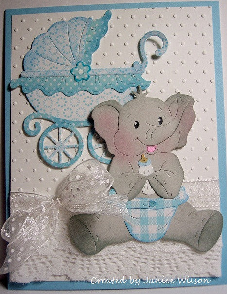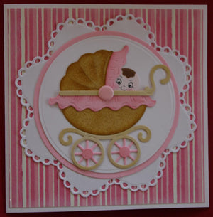 Un suaje de carriola con sus accesorios que mide 3 x 3 pulgadas aprox.