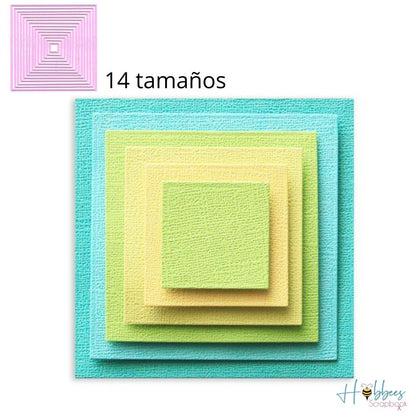 14 suajes para hacer cuadrados que miden desde 1 x 1 cm hasta 8.7 x 8.7 cm aprox.