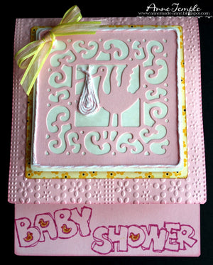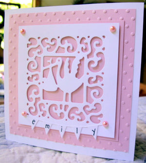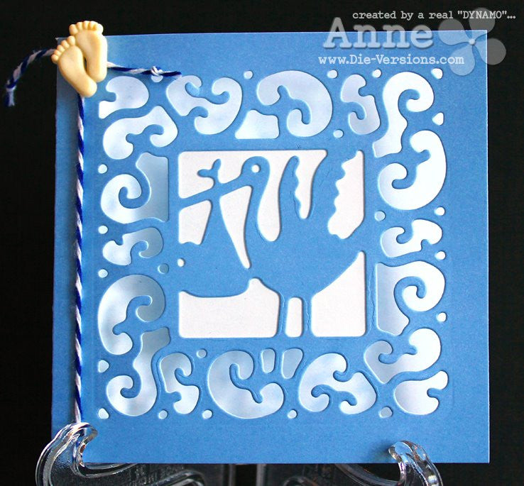 Un suaje de marco de cigueña que mide 7.6 cm x 7.6 cm aprox.