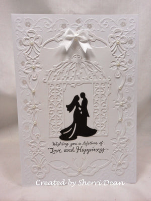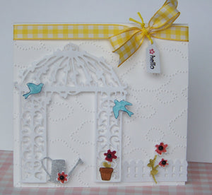 1. Un suaje de corte de mirador en el jardin, flores, paloma, maceta el suaje completo mide 6.7 cm x 9 cm aprox