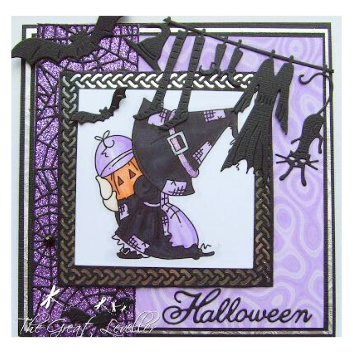 Un suaje de tendedero de ropa de bruja que trae el sombrero, las medias, las botas, el vestido y el gato el suaje completo mide 6 cm de alto x 12 cm de ancho aprox.