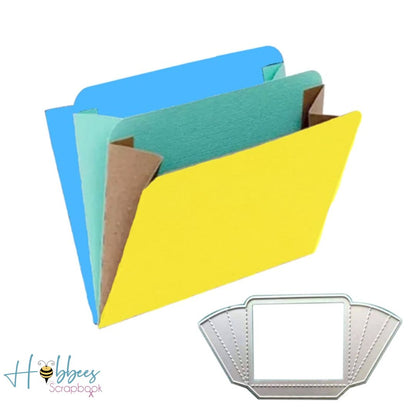 - Suaje de archivero que mide 12.7 x 6.3 cm incluídas las pestañas. El cuadro central mide 6.4 x 5.5 cm.