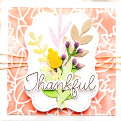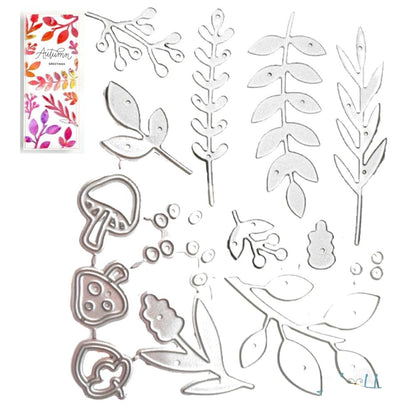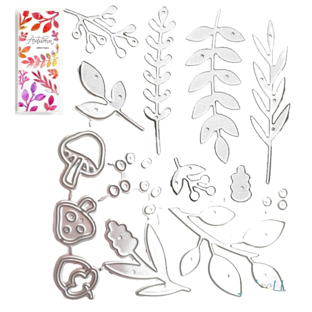 • 14 suajes que miden: honguitos4 x 3.5 cm, 4.3 x 3.2 cm, avellana 4 x 2.8 cm, rama de 5 hojas x 7.3  cm, rama de 11 hojas 10.3 x 3.5 cm, rama de 3 hojas 6 x 3.5 cm, ramita con flor de bolitas 6 x 4.6 cm,  ramita con hojas de bolitas 6 x 3.2 cm,  rama de 13 hojas 9.5 x 2 cm y  rama de 8 hojas 10.5 x 2.5 cm