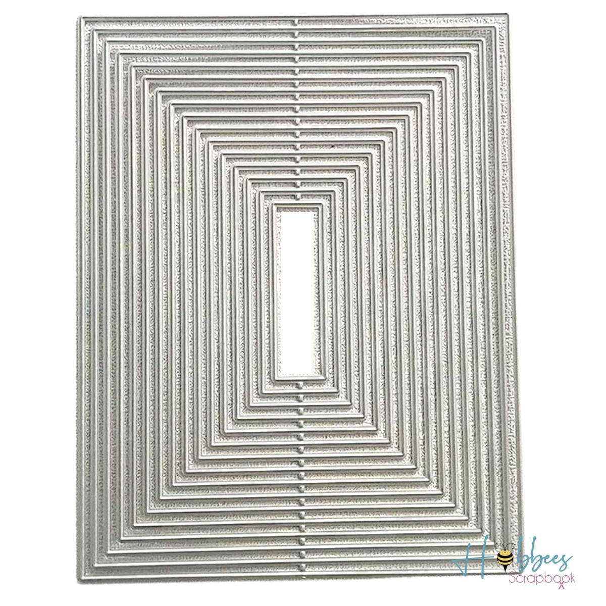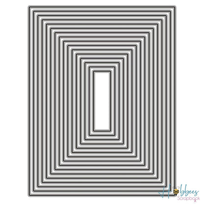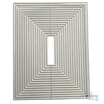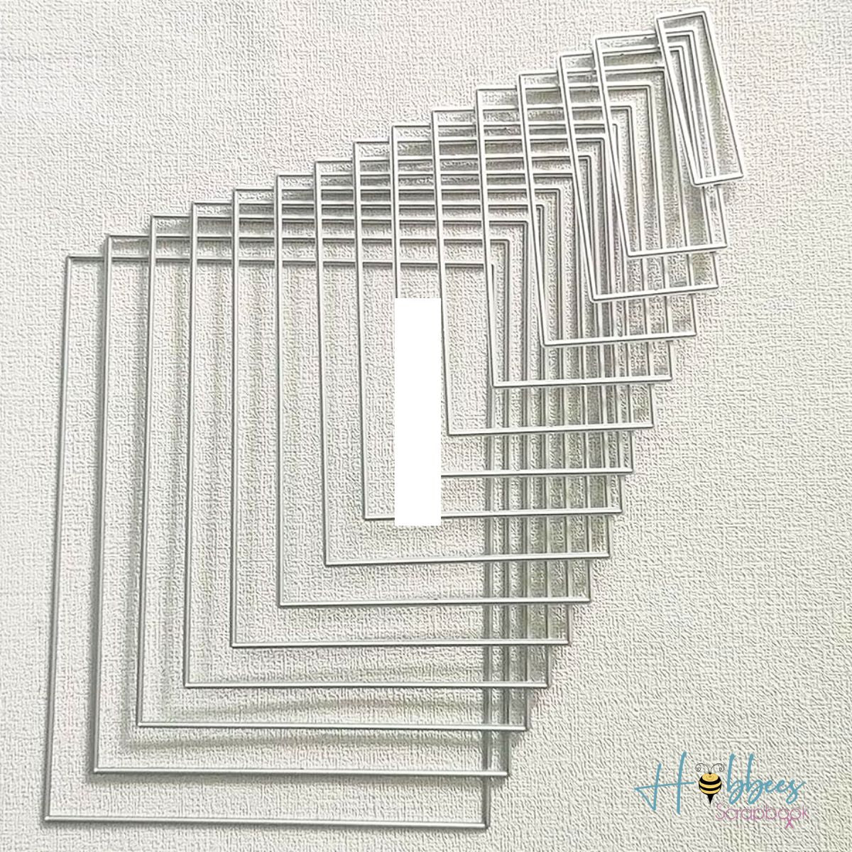 • 16 Suajes o Troqueles de Rectángulos.  El mas pequeño mide 1.5 x 4.2, con intervalos de 2 cms, entre los siguientes, siendo el más grande de  14.3 x 11.2 cm.