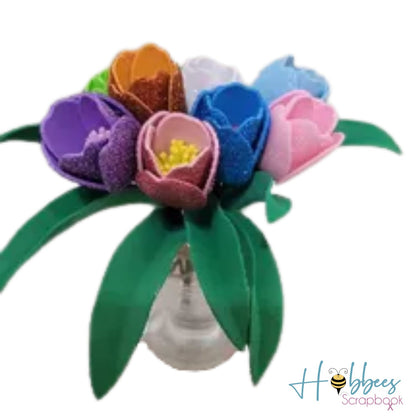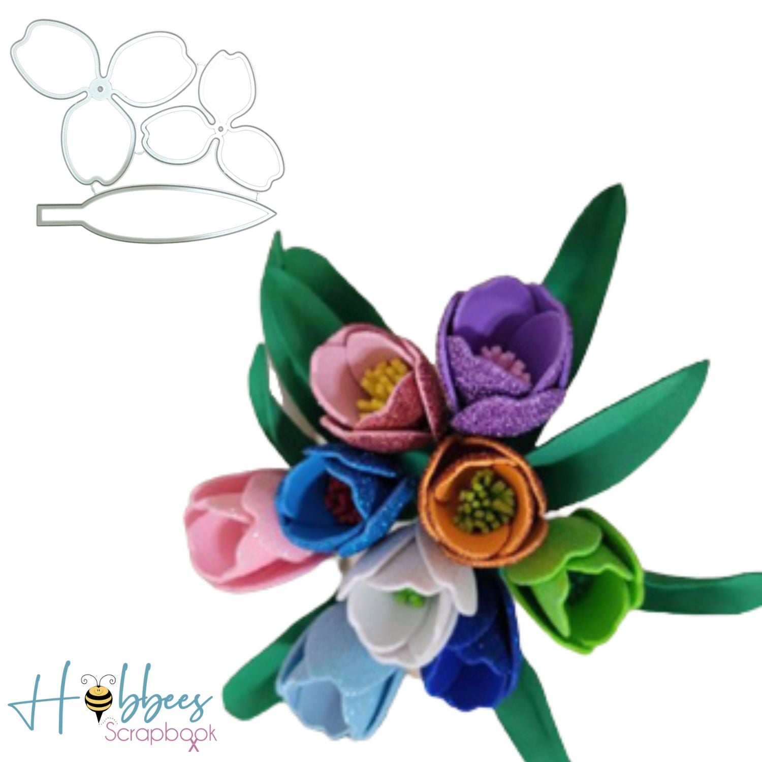 La medida de los suajes son, petálos 8 x 8 y 9.3 x 10 cm. La hoja mide 3.3 x 13.1 cm.
