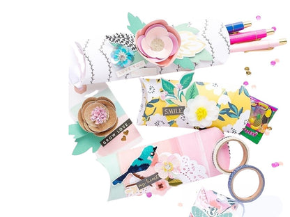 Con la perforadora incluida crea pestañas de doblado y hendiduras para cerrar tu caja. Puedes usar papel de Scrap, papel decorado o el que tú prefieras para poder hacer tus cajas personalizadas.