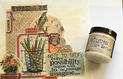 Distress Collage Mediums son medios de gel diseñados para pegar, estratificar y sellar proyectos de medios mixtos. Úselo con pinceles especialmente diseñados para la aplicación de todos los Medium Collage.