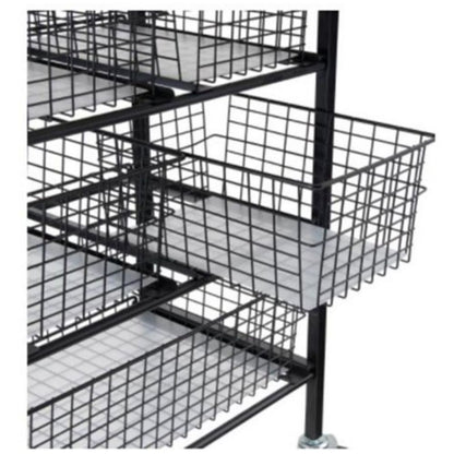 Cuenta con tres niveles: Dos de ellos están compuestos por 2 canastas pequeñas cada uno y el nivel inferior está compuesto por una canasta grande. En la parte superior tiene una base laminada, ideal para ponerle cosas arriba. El carrito tiene 4 ruedas de tipo industrial para asegurarte que van a correr de un lado a otro sin problemas.