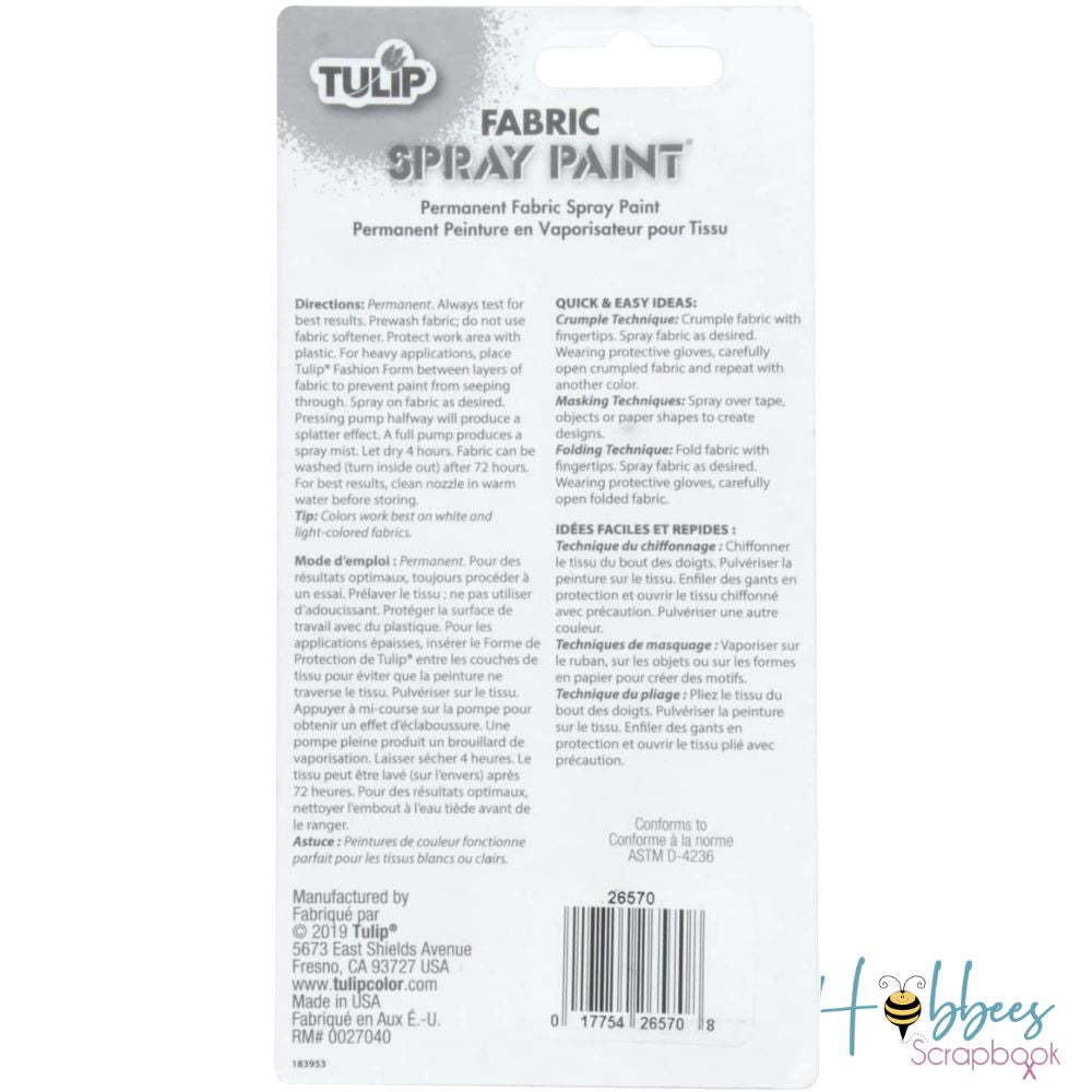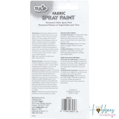 La pintura en aerosol para tela Tulip es perfecta para camisetas, zapatos de lona, bolsos de mano y más. Esta es una pintura de tela en aerosol permanente, por lo que no se requiere ajuste de calor. Rocíe ligeramente para colores pastel y más pesado para colores más vibrantes. Funciona mejor en telas blancas o de colores claros. Incluye instrucciones básicas y técnicas rápidas y fáciles.