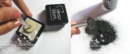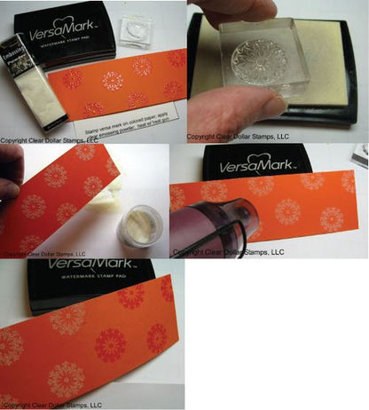 La tinta transparente VersaMark te permite realizar un montón de técnicas diferentes. Estampa la imagen en papel o cartulina y explora las posibilidades que permite: marcas de agua, estampado de tono sobre tono, técnica del "resist", y también el popular embossing con polvos de realce. Es una tinta a base de aceite, de secado lento.