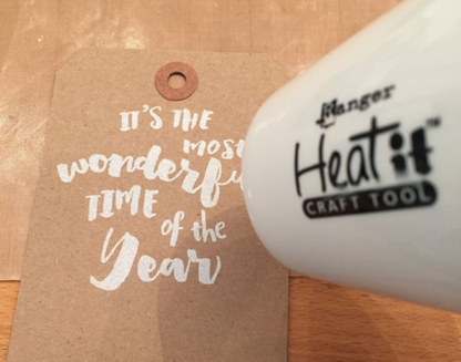 Con una tinta de secado lento, humedece y estampa tu sello favorito, después cubre con tus polvos de embossing, no escatimes, permite que se cubra todo muy bien. Estos se pegarán únicamente a la tinta, después sacude todo el restante sobre una charola Tray Mate. Y ahora con una pistola de aire caliente (heat gun o heat tool), funde los polvos y listo, obtienes un acabado realzado, muy parecido a la serigrafía.