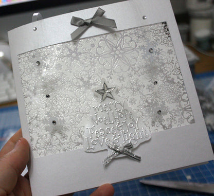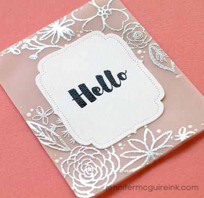 Con una tinta de secado lento, humedece y estampa tu sello favorito, después cubre con tus polvos de embossing, no escatimes, permite que se cubra todo muy bien. Estos se pegarán únicamente a la tinta, después sacude todo el restante sobre una charola Tray Mate. Y ahora con una pistola de aire caliente (heat gun o heat tool), funde los polvos y listo, obtienes un acabado realzado, muy parecido a la serigrafía.