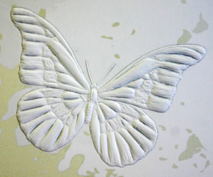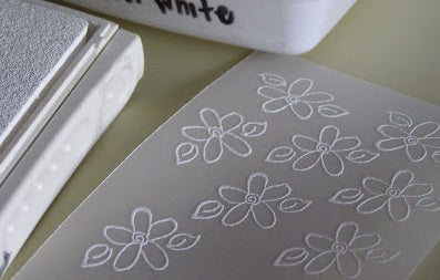 Con una tinta de secado lento, humedece y estampa tu sello favorito, después cubre con tus polvos de embossing, no escatimes, permite que se cubra todo muy bien. Estos se pegarán únicamente a la tinta, después sacude todo el restante sobre una charola Tray Mate. Y ahora con una pistola de aire caliente (heat gun o heat tool), funde los polvos y listo, obtienes un acabado realzado, muy parecido a la serigrafía.