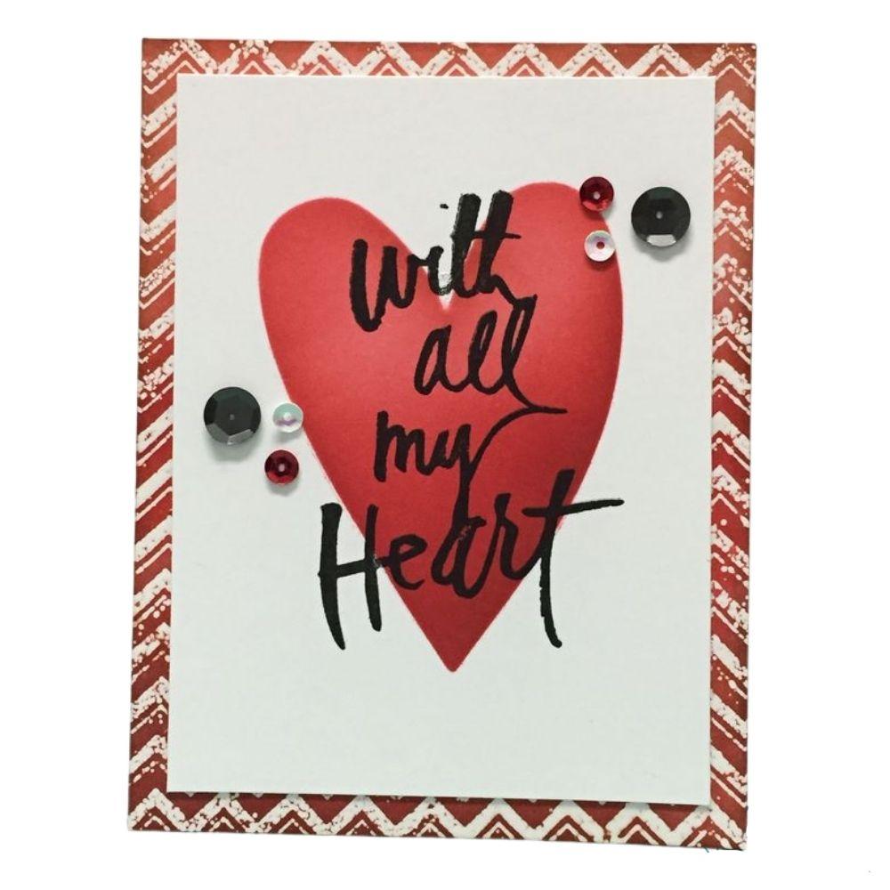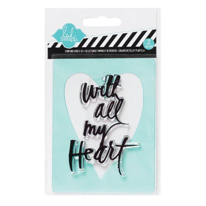 Este es un kit de sello y plantilla. El sello es “con todo mi corazón” y la plantilla es un corazón. Crea tarjetas, fondos para páginas de álbumes de recortes y mucho más con este fantástico kit.